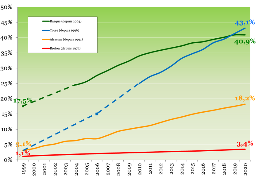 Si cette circulaire est une avancée, et sécurise l’enseignement immersif, elle ne suffira pas, à elle seule, à résoudre les difficultés rencontrées pour l’enseignement de la langue bretonne et surtout relancer son enseignement en “changeant de braquet”. Le graphique (voir ci-après) publié par l’office de la langue bretonne ainsi que le dernier rapport (les chiffres de la rentrée scolaire de l’enseignement bilingue en 2021) rendent compte de la situation délicate de l’enseignement de la langue bretonne, et donc son avenir, quand on la compare à d’autres régions en France.